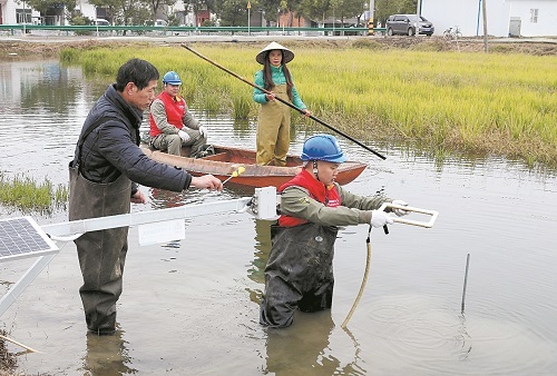 國(guó)網(wǎng)湖北潛江供電公司員工在蝦田安裝水質(zhì)監(jiān)測(cè)設(shè)備。