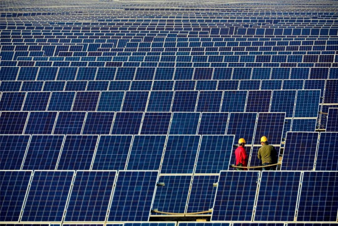國(guó)家電網(wǎng)甘肅電力連心橋共產(chǎn)黨員服務(wù)隊(duì)隊(duì)員在光伏電站開展檢查服務(wù)。