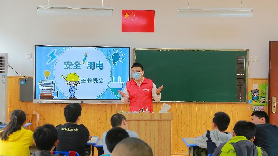 國網(wǎng)浙江諸暨供電公司志愿者在諸暨市東和鄉(xiāng)初中電力愛心教室,為同學們科普安全用電知識