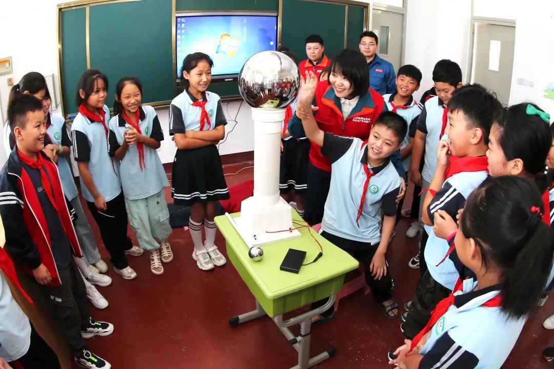 國網(wǎng)山東棗莊供電公司志愿者在薛城夏莊小學電力愛心教室,與學生一起做用電小實驗