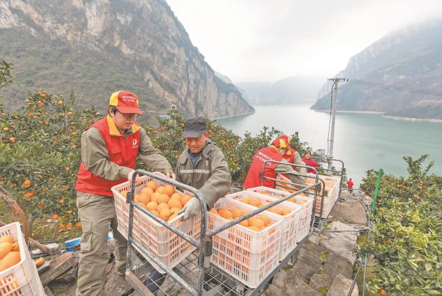 秭歸縣供電公司開展消費(fèi)幫扶活動(dòng),組織共產(chǎn)黨員服務(wù)隊(duì)隊(duì)員幫助臍橙種植戶采摘、搬運(yùn)臍橙。梅雪飛 攝