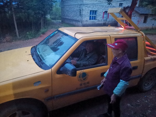 “太好了,你們來了,這下晚上可以不用摸黑了……”18時55分,經(jīng)過25分鐘的車程,陳文清班長和班員到達(dá)陳家蕪頭村,陳德文和老伴正打 著手電筒,看到供電搶修車的到來,很是激動。