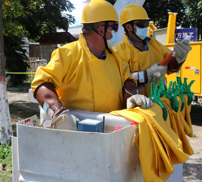 一切就緒后,現(xiàn)場(chǎng)作業(yè)人員的汗珠已經(jīng)開(kāi)始不停滾落。參與本次高空作業(yè)的兩名人員做好絕緣防護(hù)措施后,便利用絕緣斗臂車上升至十多米的高空,對(duì)線路進(jìn)行接火作業(yè)。同時(shí),現(xiàn)場(chǎng)監(jiān)護(hù)人員在作業(yè)點(diǎn)周圍,時(shí)刻關(guān)注高空帶電作業(yè)人員的操作步驟,不時(shí)提醒他們注意操作方式及安全。