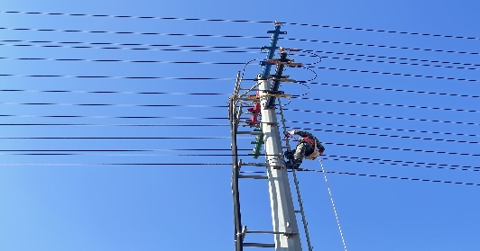 在十多米的水泥桿上,他們身系安全帶,手拿工具,時而低頭時而彎腰,努力尋找最合適的姿勢,高處作業(yè)不像平地那么自如,原本用十分的力氣便能做到的事情,在那狹小的安全距離周圍,又有多條線路的復(fù)雜作業(yè)環(huán)境下,必須使出十倍甚至百倍的力氣才能做好,當(dāng)擰好最后一顆螺絲時,他們終于松了口氣,繼續(xù)下一桿基......