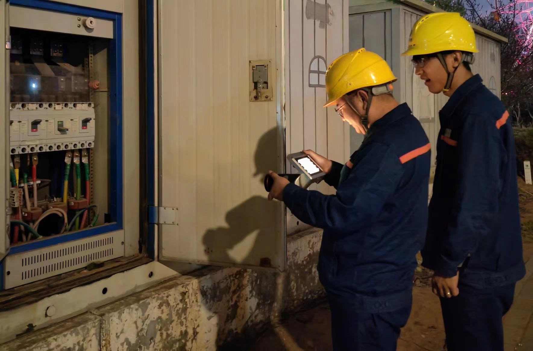 6月24日20時(shí),熙熙攘攘的人群里,郭智遠(yuǎn)和袁小龍穿行其中。今晚,他倆要完成蒙欣廣場(chǎng)和德榮2個(gè)夜市的用電安全檢查。“迎峰度夏期間工作量大,全憑兩條腿,必須要到現(xiàn)場(chǎng)實(shí)際檢查才能放心。”他們利用紅外測(cè)溫儀通過(guò)電暈、局部放電、溫升燒紅等現(xiàn)象來(lái)發(fā)現(xiàn)導(dǎo)線連接器及絕緣子存在的缺陷。對(duì)蒙欣廣場(chǎng)夜市、德榮夜市線路刀閘閘口、接頭、導(dǎo)線線夾等易發(fā)熱部位進(jìn)行全方位檢查,及時(shí)掌握設(shè)備運(yùn)行狀態(tài),避免設(shè)備出現(xiàn)故障。結(jié)束了夜市的用電安全檢查,收拾好工器具,已是22:20,但汗流浹背的兩個(gè)人并沒有回程,他們還要前往體育館的10千伏線路開展夜巡工作。