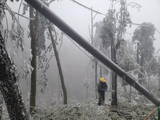 為確保景區(qū)供電需求和游客安全,該公司組織30余名黨員干部職工兵分三路,一邊緊急調(diào)集大功率發(fā)電機抬運至景區(qū),第一時間保障該線路用戶可靠供電,一邊協(xié)同云陽國家森林管理局、茶陵縣消防救援大隊緊急開展道路疏通搶險,一邊穿冰簾掃障礙,為搶修斷桿線路做準(zhǔn)備。到處是冰碴斷枝的山林里,不斷有晶瑩剔透的冰塊從樹上掉落,搶修人員一邊用柴刀對樹枝進行清理,一邊爬冰臥雪艱難前行,清理道路,運送桿線搶修物資,在零下冰凍的高山上,分秒必爭地投入到搶修中。