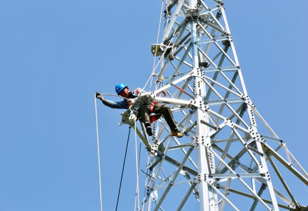 4月28日上午,在安徽利辛縣孫集鎮(zhèn)栗寨子村,國網(wǎng)利辛縣供電公司外線施工人員夏中杰正在39米高的鋼制角塔上高空作業(yè),將牽引繩順利穿過滑輪,地面的同事們通過牽引機以“線帶線”的方式將35千伏高壓輸電線從600米外連接到該角塔上。