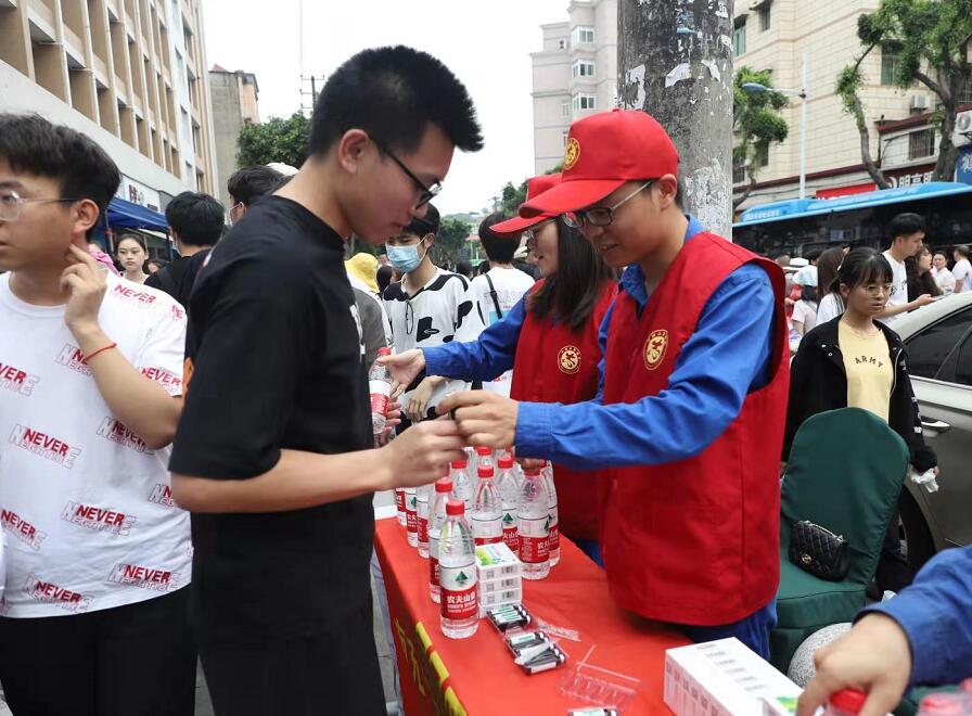 “保持平常心態(tài),加油,你們一定能考出好成績。”上午8時20分左右,隨著考生陸續(xù)進場,志愿服務(wù)點前熱鬧了起來,志愿者一邊為有需要的考生派發(fā)考試和防暑用品,一邊為他們加油鼓勁。