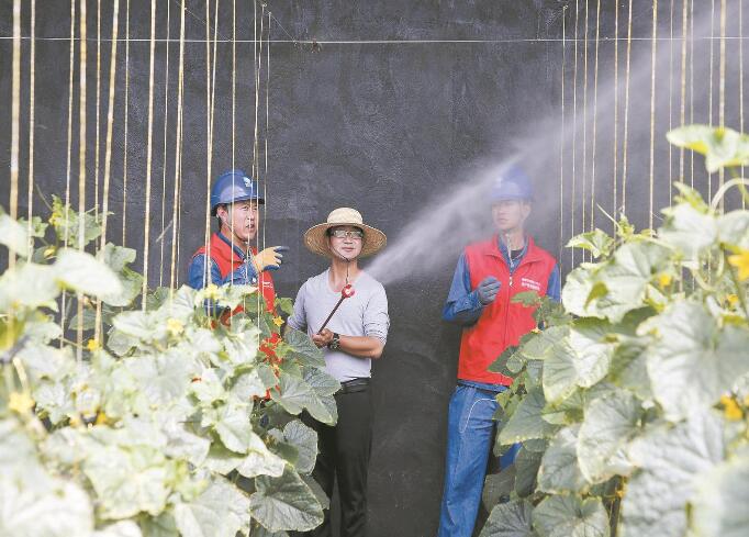 供電員工在昊苑村果蔬大棚內(nèi)了解黃瓜種植戶(hù)用電需求。攝影:袁宏彥