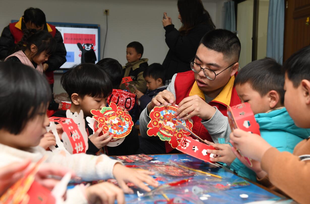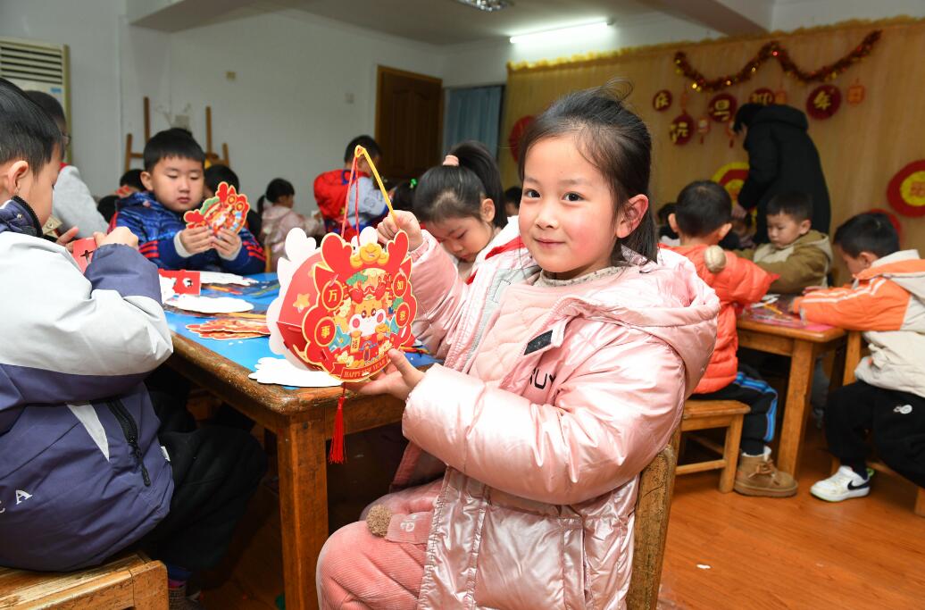隨后,志愿者與孩子們還分組一起動(dòng)手制作了“龍年小燈籠”,在志愿者的指導(dǎo)一下,整理素材、拼接卡紙、綁流蘇……孩子們一步步依次組裝。制作過程中,孩子們異常興奮,有說有笑,不一會(huì)兒他們就制作完成一盞盞漂亮的小燈籠??粗约旱膭趧?dòng)成果,孩子們的笑臉更加燦爛了。