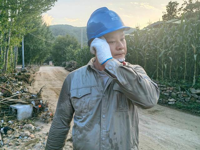 8月24日,在葫蘆島市綏中縣明水滿族鄉(xiāng)張福村,國網(wǎng)天津市電力公司應(yīng)急搶修隊員朱春雷搶修復(fù)電工作后擦拭臉上的汗珠。楊小童 攝