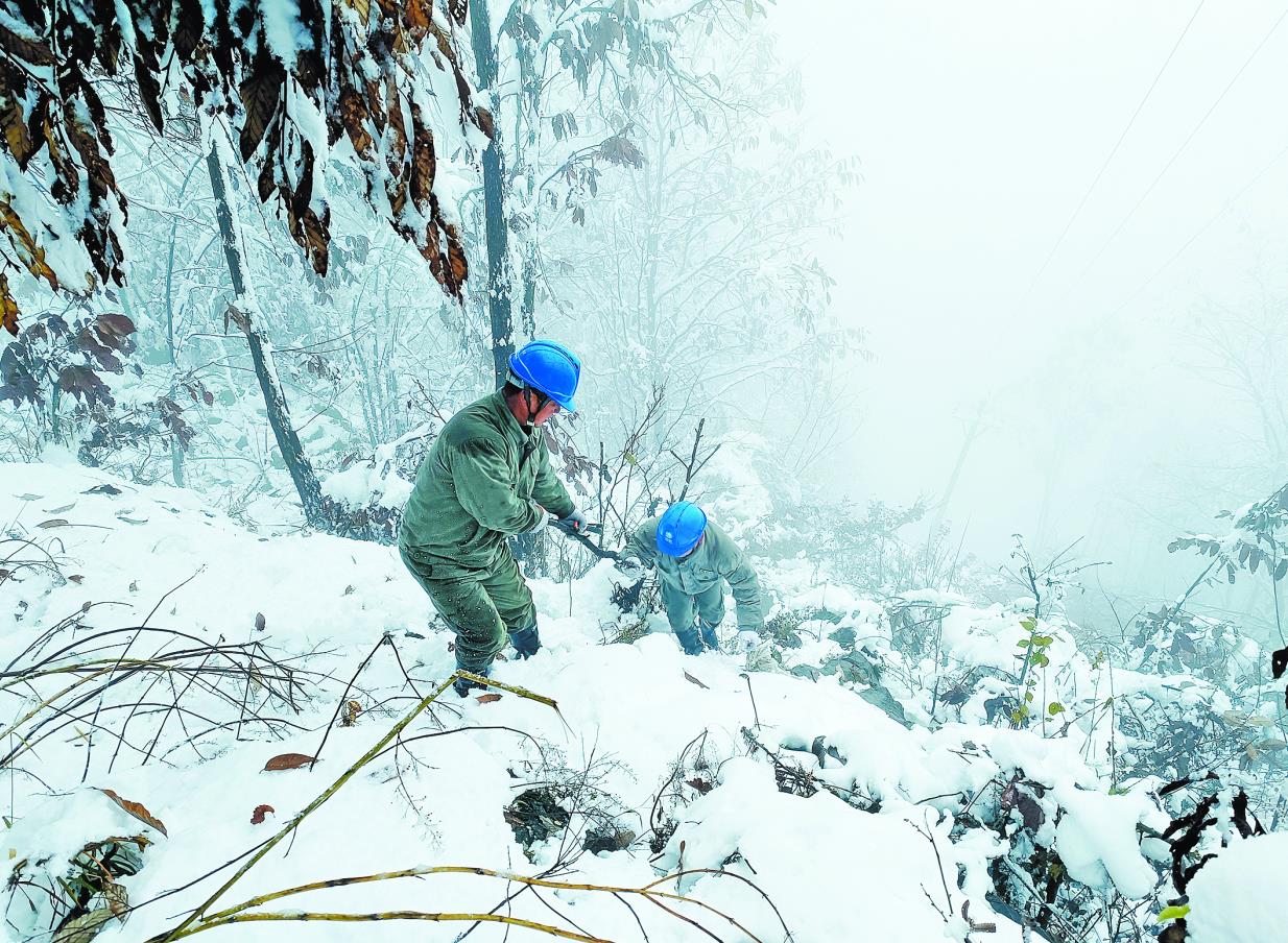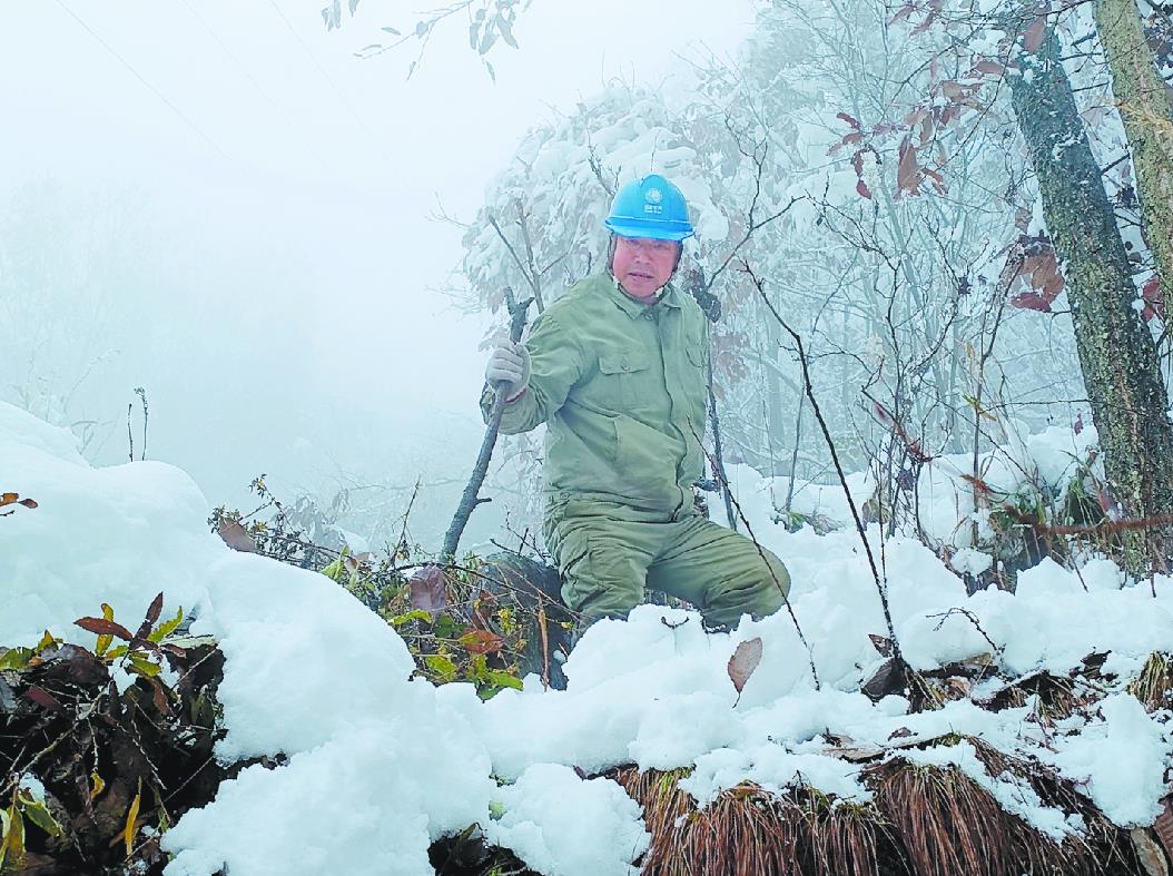國(guó)網(wǎng)鄖西縣供電公司員工借助樹(shù)木拐杖巡視易覆冰區(qū)段線(xiàn)路。