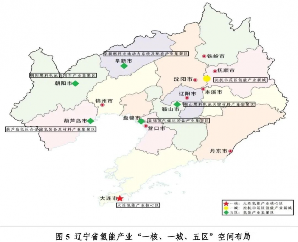 根據(jù)遼寧省現(xiàn)有氫能產(chǎn)業(yè)發(fā)展基礎(chǔ),以“合理集聚、產(chǎn)業(yè)協(xié)同、政企聯(lián)動、互為支撐”為原則進行空間布局和優(yōu)化,著力構(gòu)建“一核、一城、五區(qū)”的氫能產(chǎn)業(yè)空間發(fā)展格局。一核即大連氫能產(chǎn)業(yè)核心區(qū),一城即沈撫示范區(qū)氫能產(chǎn)業(yè)新城,五區(qū)分別是鞍山燃料電池關(guān)鍵材料產(chǎn)業(yè)集聚區(qū)、朝陽燃料電池商用車產(chǎn)業(yè)集聚區(qū)、阜新燃料電池動力系統(tǒng)及配套產(chǎn)業(yè)集聚區(qū)、葫蘆島低壓合金儲氫裝備及材料產(chǎn)業(yè)集聚區(qū)和盤錦氫氣儲運裝備產(chǎn)業(yè)集聚區(qū)。