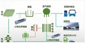利用清潔能源電力電解技術(shù)得到氫氣,將氫氣存儲(chǔ)于高效儲(chǔ)氫裝置中,再利用燃料電池技術(shù),將存儲(chǔ)的能量回饋到電網(wǎng),或者將存儲(chǔ)的高純度氫氣送入氫產(chǎn)業(yè)鏈直接利用。