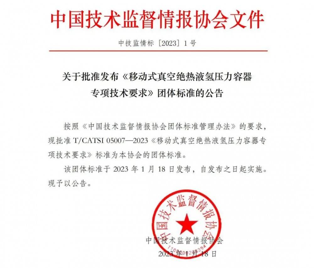 近日,中國(guó)技術(shù)監(jiān)督情報(bào)協(xié)會(huì)正式發(fā)布T/CATSI 05007—2023《移動(dòng)式真空絕熱液氫壓力容器專項(xiàng)技術(shù)要求》團(tuán)體標(biāo)準(zhǔn)(以下簡(jiǎn)稱“標(biāo)準(zhǔn)”),自發(fā)布之日起正式實(shí)施。該標(biāo)準(zhǔn)由中集安瑞科旗下南通中集能源裝備有限公司(簡(jiǎn)稱”南通能源“)牽頭起草。