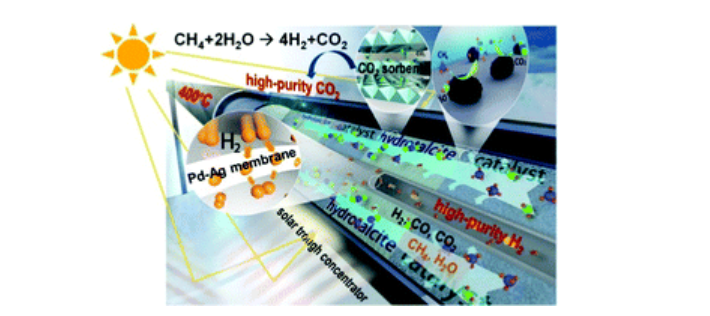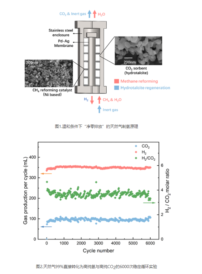 中國科學(xué)院工程熱物理研究所首次實(shí)現(xiàn)了400°C溫和條件下“凈零排放”的天然氣制氫原理突破。通過有序分離氫氣和二氧化碳產(chǎn)物,天然氣制氫反應(yīng)溫度由傳統(tǒng)的800-1000°C降至400°C以下,實(shí)現(xiàn)了99%以上甲烷直接轉(zhuǎn)化為高純氫與高純二氧化碳,并實(shí)現(xiàn)了基于化石能源的制氫與脫碳的完全協(xié)同。制氫與脫碳能耗下降幅度達(dá)20-40%?;诖耍摴ぷ鹘Y(jié)合商業(yè)化中溫槽式聚光技術(shù),實(shí)現(xiàn)了太陽能驅(qū)動(dòng)的天然氣制氫與脫碳,進(jìn)一步減少化石能源制氫的碳足跡,展示了化石能源與可再生能源互補(bǔ)實(shí)現(xiàn)可持續(xù)氫能利用的可行性。反應(yīng)溫度的降低使工業(yè)余熱與氫能的結(jié)合成為可能。迄今為止,研究人員已完成了超過6000次的穩(wěn)定循環(huán)實(shí)驗(yàn),驗(yàn)證了該方法的可靠性,并初步展示了技術(shù)轉(zhuǎn)化應(yīng)用的廣闊前景。