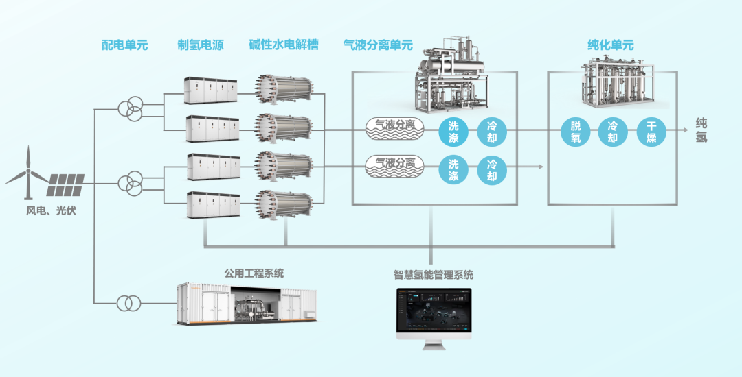 陽光氫能為該項目提供先進(jìn)的柔性制氫系統(tǒng)解決方法,包括3套四對一柔性制氫系統(tǒng)(4臺1000Nm³/h堿性水電解槽對應(yīng)1套4000Nm³/h氣液分離與純化設(shè)備)、智慧氫能管理系統(tǒng)等產(chǎn)品。為滿足不同能量來源對設(shè)備的影響以及規(guī)模化產(chǎn)氫對技術(shù)要求,結(jié)合綠氫合成氨的應(yīng)用場景,研發(fā)團(tuán)隊多次實地考察,并將四對一解決方案與項目需求反復(fù)論證。最終,以其雄厚的研發(fā)實力、專業(yè)的服務(wù)和對產(chǎn)品質(zhì)量的嚴(yán)格把控,獲得業(yè)主好評。