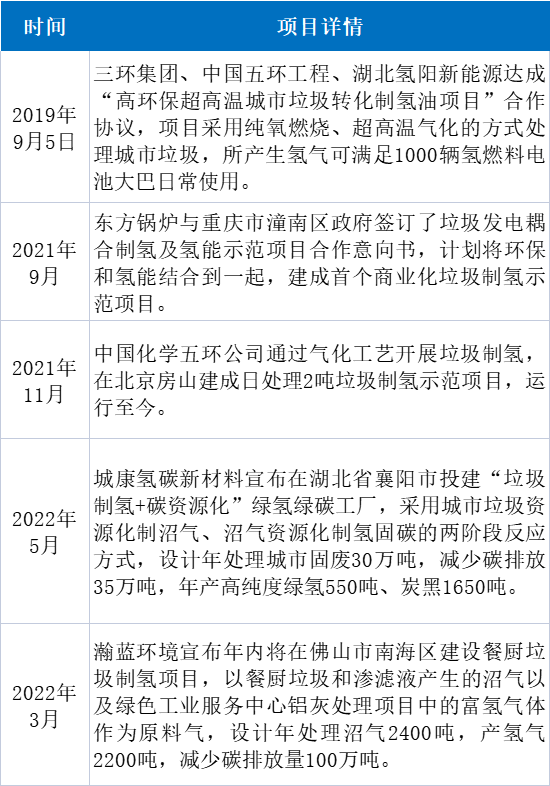 國內而言,主要以環(huán)保企業(yè)、頗具實力的上市公司開拓業(yè)務為主。三環(huán)集團、瀚藍環(huán)境、中國化學、東方鍋爐等陸續(xù)從2019年開始布局垃圾制氫項目。詳情如下: