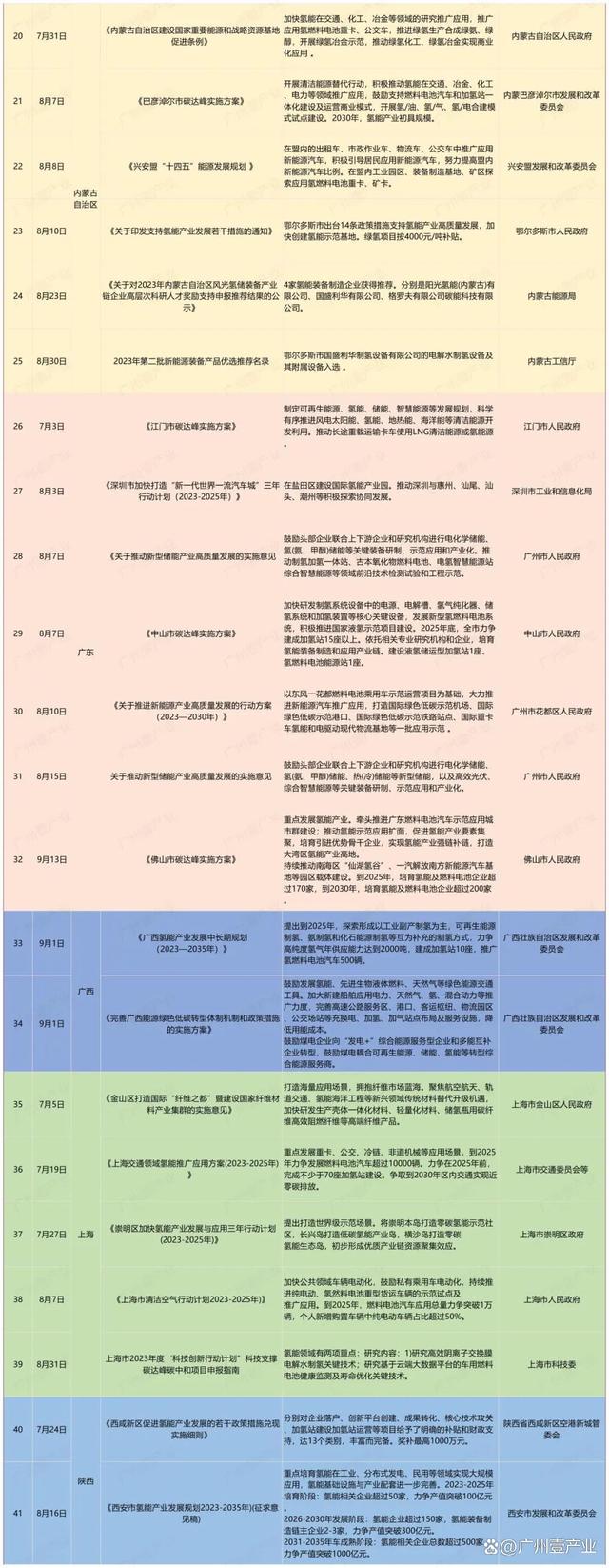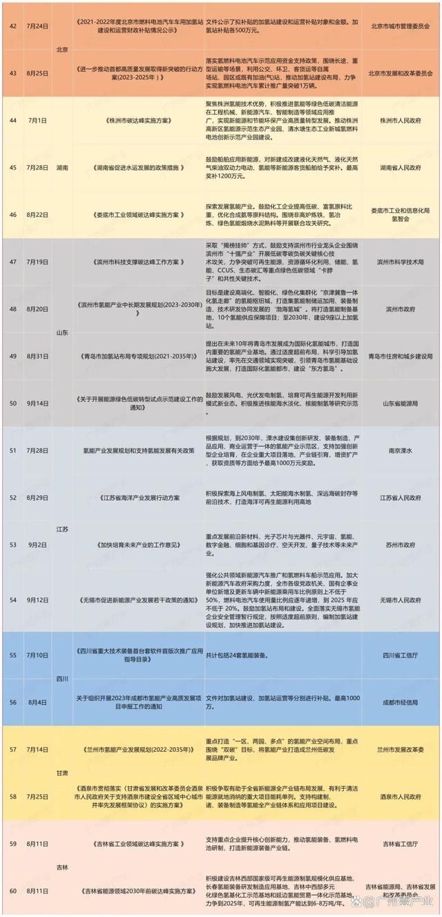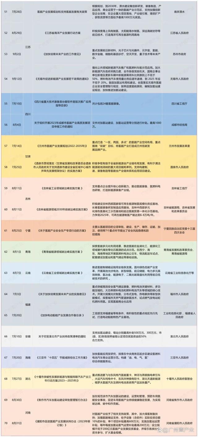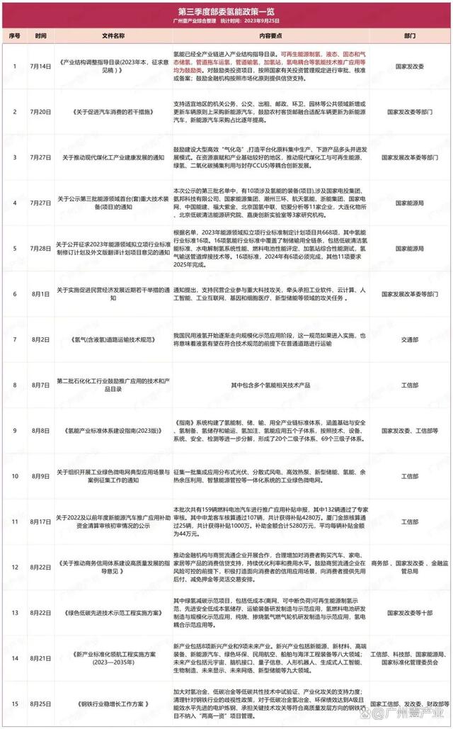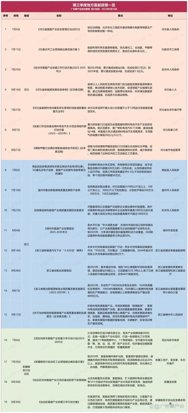 9月17日,浙江省嵊州市人民政府發(fā)布了《關于加快推進新能源裝備產(chǎn)業(yè)高質(zhì)量發(fā)展的實施意見(征求意見稿)》。其中提到,積極布局發(fā)展氫能產(chǎn)業(yè)。布局發(fā)展氫能“制儲輸用”、氫燃料電池系統(tǒng)等氫能產(chǎn)業(yè)鏈。9月14日,山東省能源局發(fā)布了《關于開展能源綠色低碳轉(zhuǎn)型試點示范建設工作的通知》。文件中涉及到氫能的內(nèi)容有:鼓勵發(fā)展風電、光伏發(fā)電制氫,培育可再生能源開發(fā)利用新模式新業(yè)態(tài);積極推進核能海水淡化、核能制氫等研究示范等。9月13日,佛山市人民政府印發(fā)了《佛山市碳達峰實施方案》的通知。方案中提到,重點發(fā)展氫能產(chǎn)業(yè)。牽頭推進廣東燃料電池汽車示范應用城市群建設,強化城市群內(nèi)各市資源共享、優(yōu)勢互補。加強氫能基礎設施建設。推動氫能示范應用擴面,促進氫能產(chǎn)業(yè)要素集聚,培育引進優(yōu)勢骨干企業(yè),實現(xiàn)氫能產(chǎn)業(yè)強鏈補鏈,打造大灣區(qū)氫能產(chǎn)業(yè)高地。持續(xù)推動南海區(qū)“仙湖氫谷”、一汽解放南方新能源汽車基地等園區(qū)載體建設。到2025年,培育氫能及燃料電池企業(yè)超過170家,到2030年,培育氫能及燃料電池企業(yè)超過200家。......據(jù)廣州壹產(chǎn)業(yè)不完全統(tǒng)計,截至9月25日,今年第三季度(7、8、9月),部委共發(fā)布15條與氫能相關的政策,地方則有23個省(市)發(fā)布了70條氫能政策,合計85條。