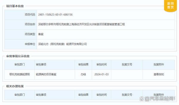 近日,深能鄂爾多斯市鄂托克前旗上海廟經濟開發(fā)區(qū)光伏制氫項目配套輸氫管道工程獲批,鄂托克前旗能源局就該項目發(fā)布《項目備案告知書》。本項目屬于深能鄂爾多斯市鄂托克前旗上海廟經濟開發(fā)區(qū)光伏制氫項目配套輸氫管道工程,新建一條DN150mm輸氫管線,供氣流量約5000標方每小時,管線長度約2km,起于深能北方(鄂托克前旗)能源開發(fā)有限公司鄂爾多斯市鄂托克前旗上海廟經濟開發(fā)區(qū)光伏制氫項目,止于潤陽悅達光伏裝備制造全產業(yè)鏈科技示范項目。