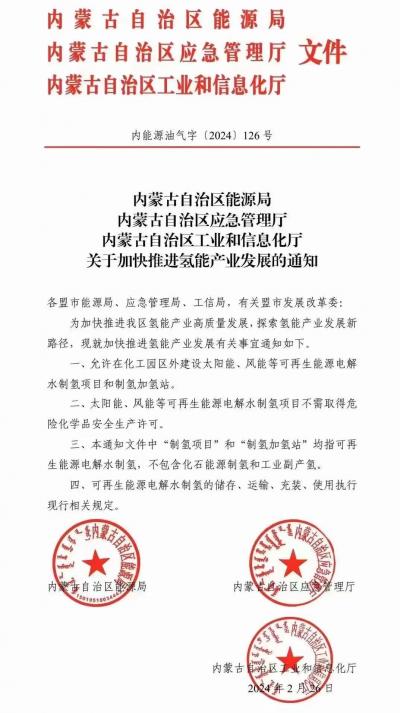通知明確,允許在化工園區(qū)外建設(shè)太陽能、風(fēng)能等可再生能源電解水制氫項目和制氫加氫站。太陽能、風(fēng)能等可再生能源電解水制氫項目不需取得危險化學(xué)品安全生產(chǎn)許可。可再生能源電解水制氫的儲存、運(yùn)輸、充裝、使用執(zhí)行現(xiàn)行相關(guān)規(guī)定。