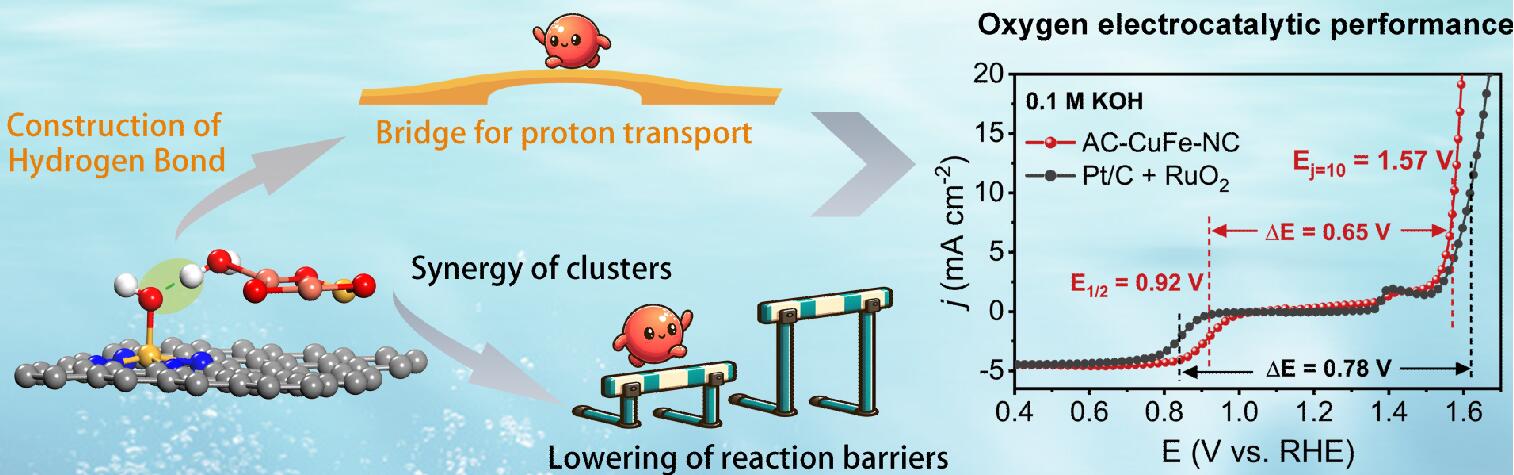 基于此,研究工作2報道了一種原子全暴露的Fe摻雜的CuO團簇與單原子位點協(xié)同的新型催化劑。實驗和DFT計算表明:一方面,協(xié)同的Cu-O-Fe 團簇能有效誘導鐵單原子位點的電子結構重新分布、調節(jié)氧吸附能并降低 ORR 勢壘;另一方面,譜學表征和理論計算表明Cu-O-Fe團簇協(xié)同構建了含氧反應中間體與電解質分子之間的氫鍵,所構建的氫鍵不僅可以穩(wěn)定含氧反應中間體,同時拉伸了ORR最后一步的Fe-O鍵長,有助于OH*的脫附;更為質子傳輸提供了通道,提高了反應動力學。這項研究中展示的新穎的催化劑結構和協(xié)同機制,為開發(fā)綠色能源轉換裝置中的高性能催化劑提供了新的視角和參考。