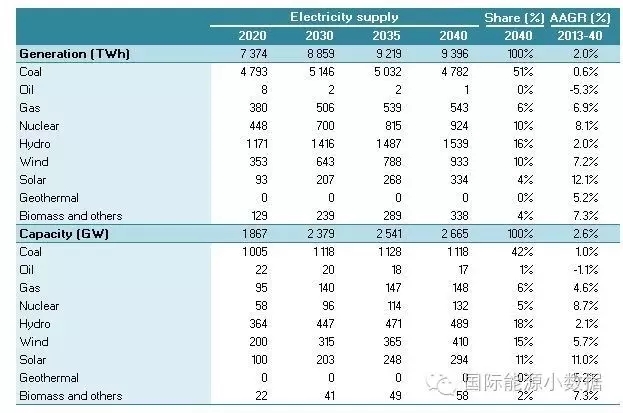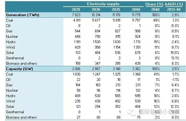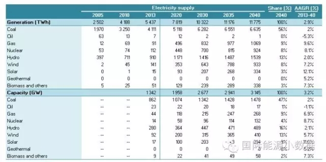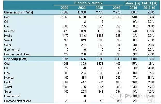 2040 年一次能源供應(yīng)達(dá)到46.95億噸標(biāo)油,其中煤炭占51%、石油16%、天然氣13%、核電5%、水電3%、非水可再生能源12%。從發(fā)電量來(lái)看,2040年總裝機(jī)達(dá)3145吉瓦,發(fā)電量達(dá)11.78萬(wàn)億千瓦時(shí),煤電占56%、天然氣發(fā)電9%、核電8%、水電13%、風(fēng)電8%、光伏3%、生物質(zhì) 3%。