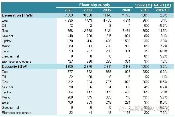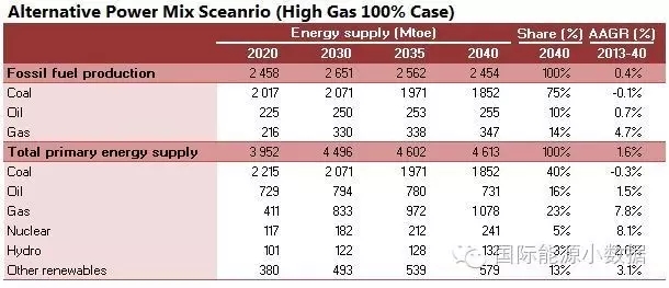 在大力推廣天然氣發(fā)電的情境下,2040年一次能源供應(yīng)為46.13億噸標(biāo)油,其中煤炭跌至40%、石油16%、天然氣高達(dá)23%、核電5%、水電3%、非水可再生能源13%。從發(fā)電量來(lái)看,2040年總裝機(jī)達(dá)3146吉瓦,發(fā)電量達(dá)11.78萬(wàn)億千瓦時(shí),煤電占36%、天然氣發(fā)電30%、核電8%、水電 13%、風(fēng)電8%、光伏3%、生物質(zhì)3%。