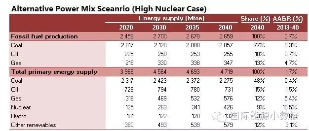 在高核電比例的情境下,2040年一次能源供應(yīng)達(dá)到47.19億噸標(biāo)油,其中煤炭占48%、石油15%、天然氣12%、核電9%、水電3%、非水可再生能源12%。從發(fā)電量來(lái)看,2040年總裝機(jī)達(dá)3146吉瓦,發(fā)電量達(dá)11.78萬(wàn)億千瓦時(shí),燃煤發(fā)電占51%、天然氣發(fā)電8%、核電14%、水電13%、風(fēng)電8%、光伏3%、生物質(zhì)3%。