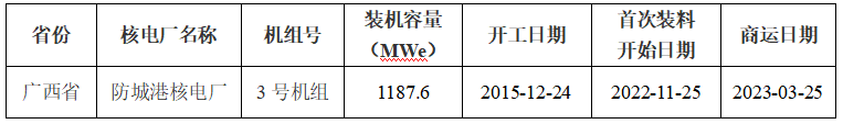 1)防城港核電廠(chǎng)3號(hào)機(jī)組2023年3月25日商運(yùn),機(jī)組2023年調(diào)試期間累計(jì)發(fā)電量、上網(wǎng)電量分別為8.02413億度、7.47180億度。