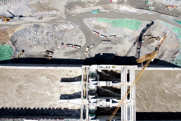 圖為枕頭壩二級(jí)水電站基坑大開(kāi)挖現(xiàn)場(chǎng)