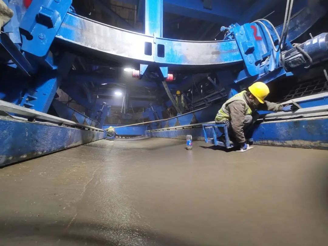 有壓段全斷面首倉(cāng)混凝土澆筑成功拉哇水電站泄洪洞有壓段隧洞段洞長(zhǎng)456.60米,洞室埋設(shè)85米,屬世界級(jí)埋深的泄洪洞。施工過(guò)程中,面臨著保證混凝土密實(shí)度、表面平整度、光滑度、減少氣泡和裂縫等施工重難點(diǎn),為滿足提前半年發(fā)電目標(biāo)要求,項(xiàng)目部全力加快施工進(jìn)度,并做好已澆筑底板的表面保護(hù)工作。相比較于泄洪洞無(wú)壓段首倉(cāng),有壓段全斷面首倉(cāng)混凝土澆筑首次采用全圓針梁底拱橫向滑模襯砌鋼模臺(tái)車,以此達(dá)到支模、收模良好效果。