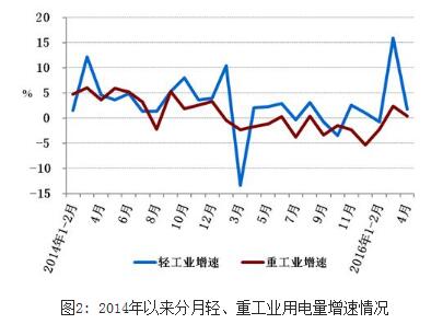 1-4月份,全國工業(yè)用電量12369億千瓦時(shí),同比增長0.2%,增速比上年同期提高1.0個(gè)百分點(diǎn),占全社會用電量的比重為68.4%,對全社會用電量增長的貢獻(xiàn)率為4.5%。其中,輕工業(yè)用電量2075億千瓦時(shí),同比增長3.6%,增速比上年同期提高1.7個(gè)百分點(diǎn);重工業(yè)用電量為10295億千瓦時(shí),同比下降0.5%,增速比上年同期提高0.8個(gè)百分點(diǎn)。