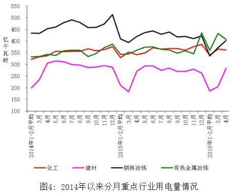 1-4月份,化學(xué)原料制品、非金屬礦物制品、黑色金屬冶煉、有色金屬冶煉四大高載能行業(yè)用電量合計(jì)5267億千瓦時(shí),同比下降 4.4%,增速比上年同期回落2.7個(gè)百分點(diǎn);合計(jì)用電量占全社會用電量的比重為29.1%,對全社會用電量增長的貢獻(xiàn)率為-47.8%。其中,化工行業(yè)用電量1405億千瓦時(shí),同比增長4.0%,增速比上年同期提高1.1個(gè)百分點(diǎn);建材行業(yè)用電量858億千瓦時(shí),同比下降2.2%,增速比上年同期提高4.3個(gè)百分點(diǎn);黑色金屬冶煉行業(yè)用電量1443億千瓦時(shí),同比下降11.6%;增速比上年同期回落4.7個(gè)百分點(diǎn);有色金屬冶煉行業(yè)1562億千瓦時(shí),同比下降5.4%,增速比上年同期回落9.1個(gè)百分點(diǎn)。