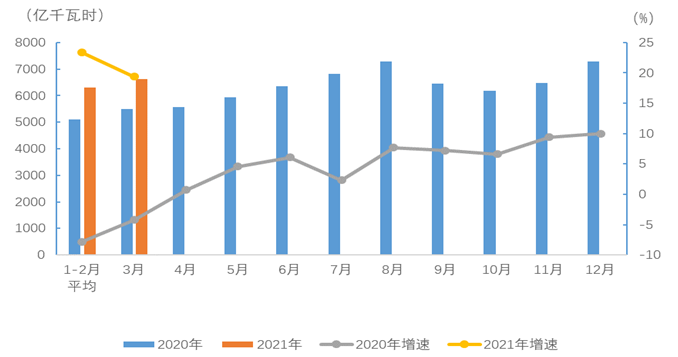 1-3月,全國全社會用電量19219億千瓦時(shí),同比增長21.2%,其中,3月份全國全社會用電量6631億千瓦時(shí),同比增長19.4%。