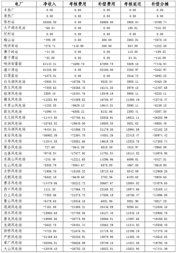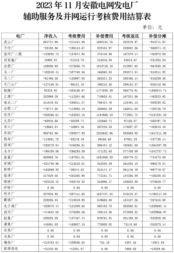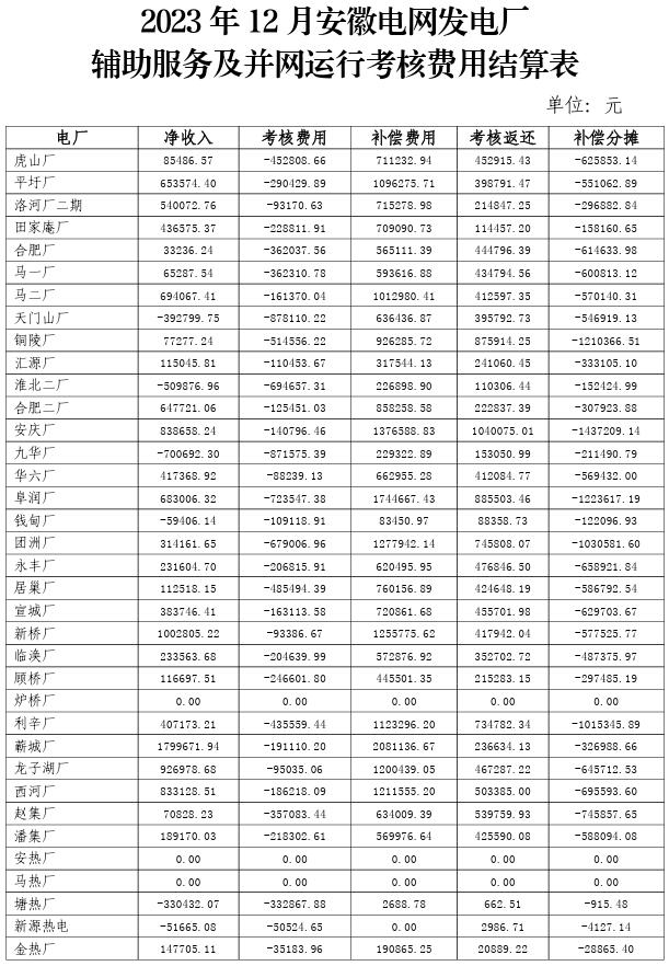 根據(jù)華東區(qū)域“兩個細(xì)則”規(guī)則要求,國網(wǎng)安徽省電力有限公司完成了2023年10-12月直調(diào)電廠并網(wǎng)運(yùn)行考核、輔助服務(wù)補(bǔ)償統(tǒng)計計算,并向我局報送了并網(wǎng)運(yùn)行考核及輔助服務(wù)補(bǔ)償情況。其中,吉泉直流配套跨省跨區(qū)新建火電機(jī)組調(diào)試運(yùn)行期差額資金共計8882813.74元,納入12月輔助服務(wù)補(bǔ)償。2023年10-12月安徽電網(wǎng)發(fā)電廠輔助服務(wù)補(bǔ)償及并網(wǎng)運(yùn)行考核費(fèi)用結(jié)算表詳見附件,現(xiàn)予公示。如有不同意見,可于3月1日前向我局反映。