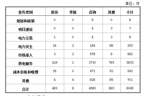 投訴舉報主要集中在電力行業(yè),共472件。從業(yè)務(wù)分類情況看,電力交易方面1件,占0.21%;電力安全方面20件,占4.24%;市場準(zhǔn)入方面5件,占1.06%;供電服務(wù)方面420件,占88.98%;成本價格和收費方面18件,占3.81%;其他方面8件,占1.69%。(2018年1月電力行業(yè)有效信息按業(yè)務(wù)分類情況見表二)
