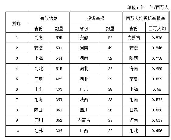 2018年1月,各?。ㄗ灾螀^(qū)、直轄市)按照有效信息數(shù)量排序,河南、安徽、上海等?。ㄊ校┝腥珖?0位;按照投訴舉報數(shù)量排序,安徽、河南、湖南等省排在全國前10位;按照百萬人均投訴舉報率排序,內(nèi)蒙古、安徽、陜西等?。ㄗ灾螀^(qū))位于全國前10位。(2018年1月有效信息及投訴舉報排名前10位情況見表三)