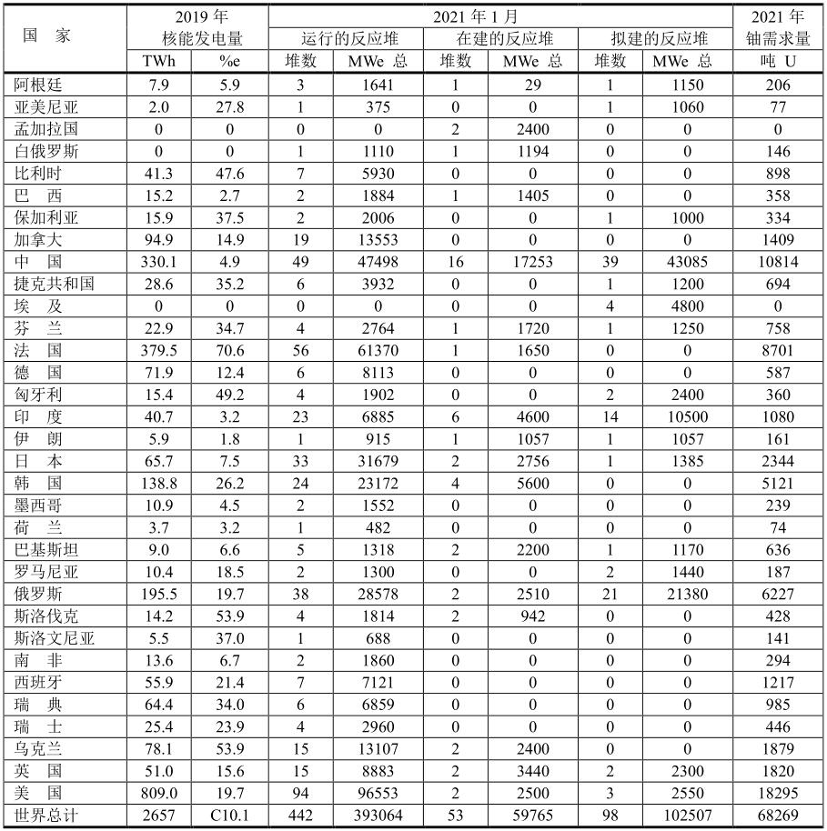 表中“%e”表示核能發(fā)電占發(fā)電總量的百分率。全球核能發(fā)電占全球發(fā)電總量的10.1%,其中法國(guó)高達(dá)70.6%。本數(shù)據(jù)是世界核能協(xié)會(huì)WNA 2021年1月份提供的數(shù)據(jù)。