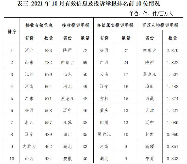 各省(自治區(qū)、直轄市)按照接收的有效信息數(shù)量排序,河北、山東、江蘇、河南、廣東、陜西、浙江、遼寧、內(nèi)蒙古、山西列全國前10位;按照接收的投訴舉報數(shù)量排序,陜西、內(nèi)蒙古、山東、河北、黑龍江、遼寧、江蘇、四川、湖北、安徽排在全國前10位;按照辦結(jié)屬實(shí)的投訴舉報數(shù)量排序,陜西、廣西、云南、遼寧、吉林、重慶、四川、黑龍江、河南、湖北排在全國前10位;按照百萬人均投訴舉報數(shù)量排序,內(nèi)蒙古、陜西、黑龍江、海南、西藏、天津、遼寧、甘肅、新疆、寧夏排在全國前10位。(2021年10月有效信息及投訴舉報排名前10位情況見表三)