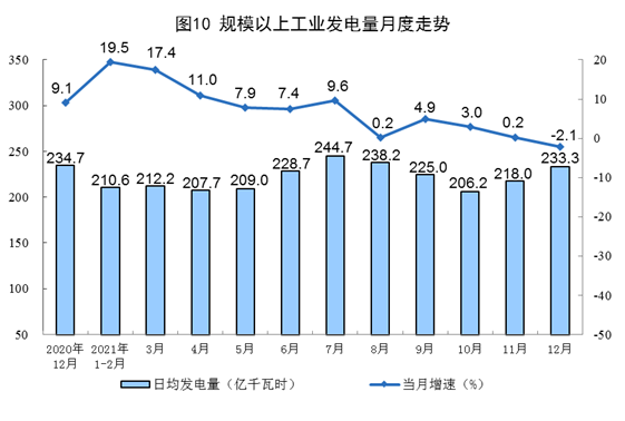 電力生產(chǎn)同比下降。12月份,發(fā)電7234億千瓦時,同比下降2.1%,上月為增長0.2%,比2019年同期增長6.8%,兩年平均增長3.4%,日均發(fā)電233.3億千瓦時。2021年,發(fā)電81122億千瓦時,比上年增長8.1%,比2019年增長11.0%,兩年平均增長5.4%。