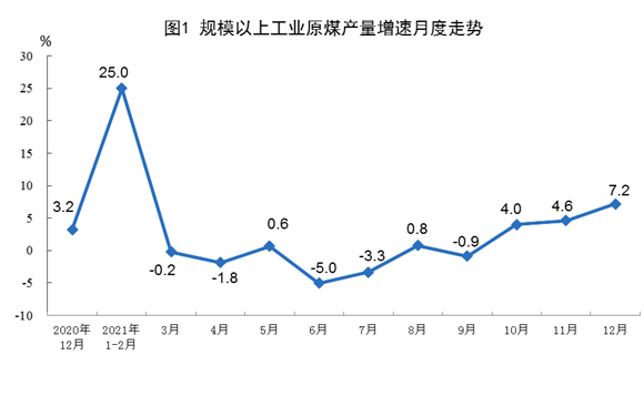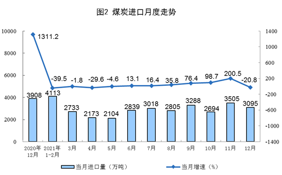 原煤生產(chǎn)繼續(xù)加快,進口由增轉(zhuǎn)降。隨著增產(chǎn)保供政策持續(xù)推進,12月份,生產(chǎn)原煤3.8億噸,同比增長7.2%,增速比上月加快2.6個百分點,比2019年同期增長10.7%,兩年平均增長5.2%,日均產(chǎn)量1241萬噸;進口煤炭3095萬噸,同比下降20.8%。
