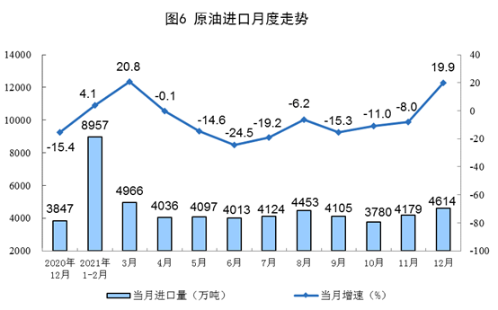 天然氣進口增速回落。12月份,進口天然氣1165萬噸,同比增長3.8%,增速比上月回落14.0個百分點。2021年,進口天然氣12136萬噸,比上年增長19.9%。