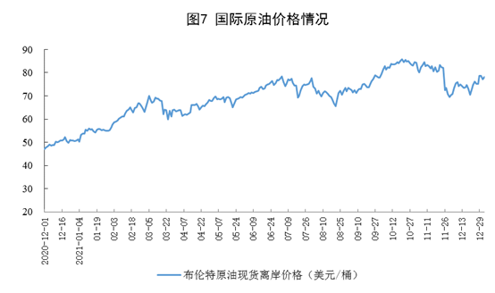原油進口由降轉(zhuǎn)增,國際原油價格上漲。12月份,進口原油4614萬噸,同比增長19.9%,上月為下降8.0%;2021年,進口原油51298萬噸,比上年下降5.4%。12月31日,布倫特原油現(xiàn)貨離岸價格為77.24美元/桶,比11月30日的70.86美元/桶上漲9.0%。