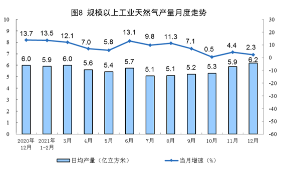 天然氣生產(chǎn)放緩。12月份,生產(chǎn)天然氣192億立方米,同比增長2.3%,增速比上月放緩2.1個百分點,比2019年同期增長16.4%,兩年平均增長7.9%,日均產(chǎn)量6.2億立方米。