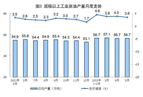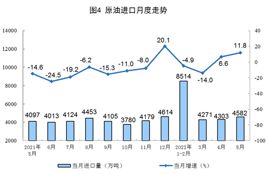 原油生產(chǎn)平穩(wěn),進口有所加快。5月份,生產(chǎn)原油1757萬噸,同比增長3.6%,增速比上月放緩0.4個百分點,日均產(chǎn)量56.7萬噸。進口原油4582萬噸,同比增長11.8%,比上月加快5.2個百分點。