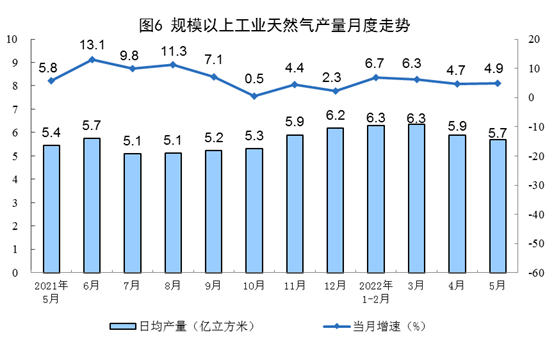 天然氣生產(chǎn)保持穩(wěn)定,進口降幅收窄。5月份,生產(chǎn)天然氣177億立方米,同比增長4.9%,增速比上月加快0.2個百分點,日均產(chǎn)量5.7億立方米。進口天然氣907萬噸,同比下降12.1%,降幅比上月收窄7.5個百分點。
