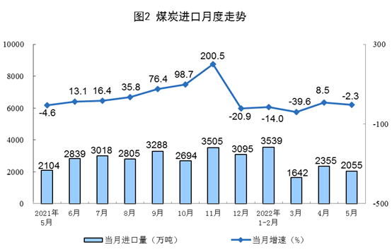 原煤生產(chǎn)保持較快增長,進口由增轉(zhuǎn)降。隨著煤炭保供穩(wěn)價政策深入推進,原煤生產(chǎn)繼續(xù)保持較快增長。5月份,生產(chǎn)原煤3.7億噸,同比增長10.3%,增速比上月放緩0.4個百分點,日均產(chǎn)量1187萬噸。進口煤炭2055萬噸,同比下降2.3%,上月為增長8.5%。