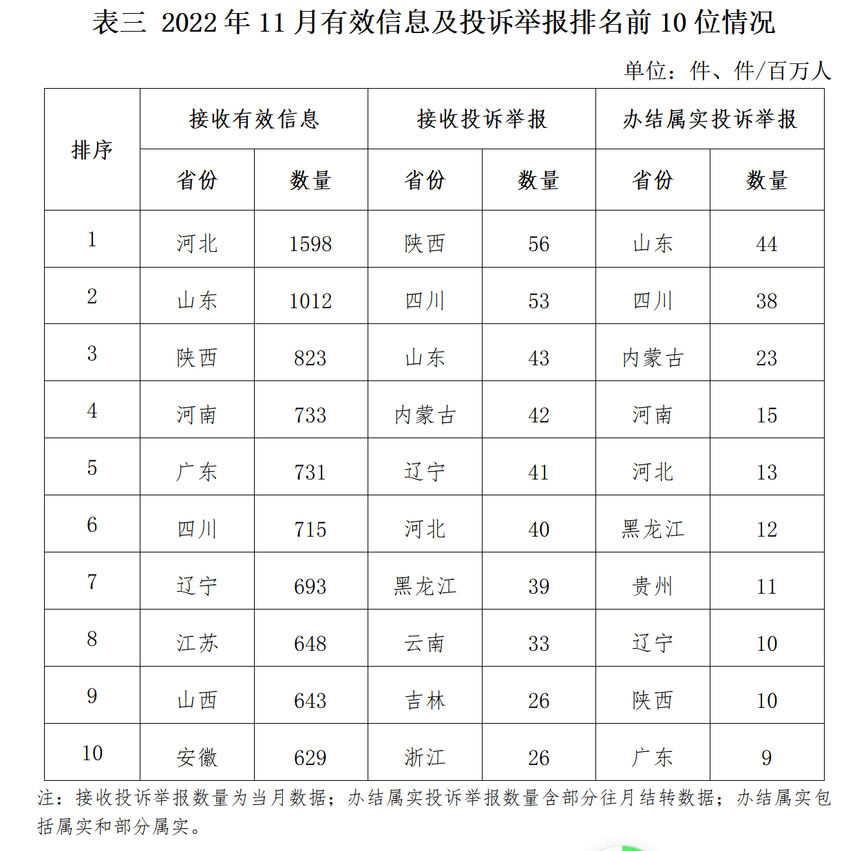 各省(自治區(qū)、直轄市)按照接收的有效信息數(shù)量排序,河北、山東、陜西、河南、廣東、四川、遼寧、江蘇、山西、安徽排在全國前10位;按照接收的投訴舉報(bào)數(shù)量排序,陜西、四川、山東、內(nèi)蒙古、遼寧、河北、黑龍江、云南、吉林、浙江排在全國前10位;按照辦結(jié)屬實(shí)的投訴舉報(bào)數(shù)量排序,山東、四川、內(nèi)蒙古、河南、河北、黑龍江、貴州、遼寧、陜西、廣東古排在全國前10位。(2022年11月有效信息及投訴舉報(bào)排名前10位情況見表三)