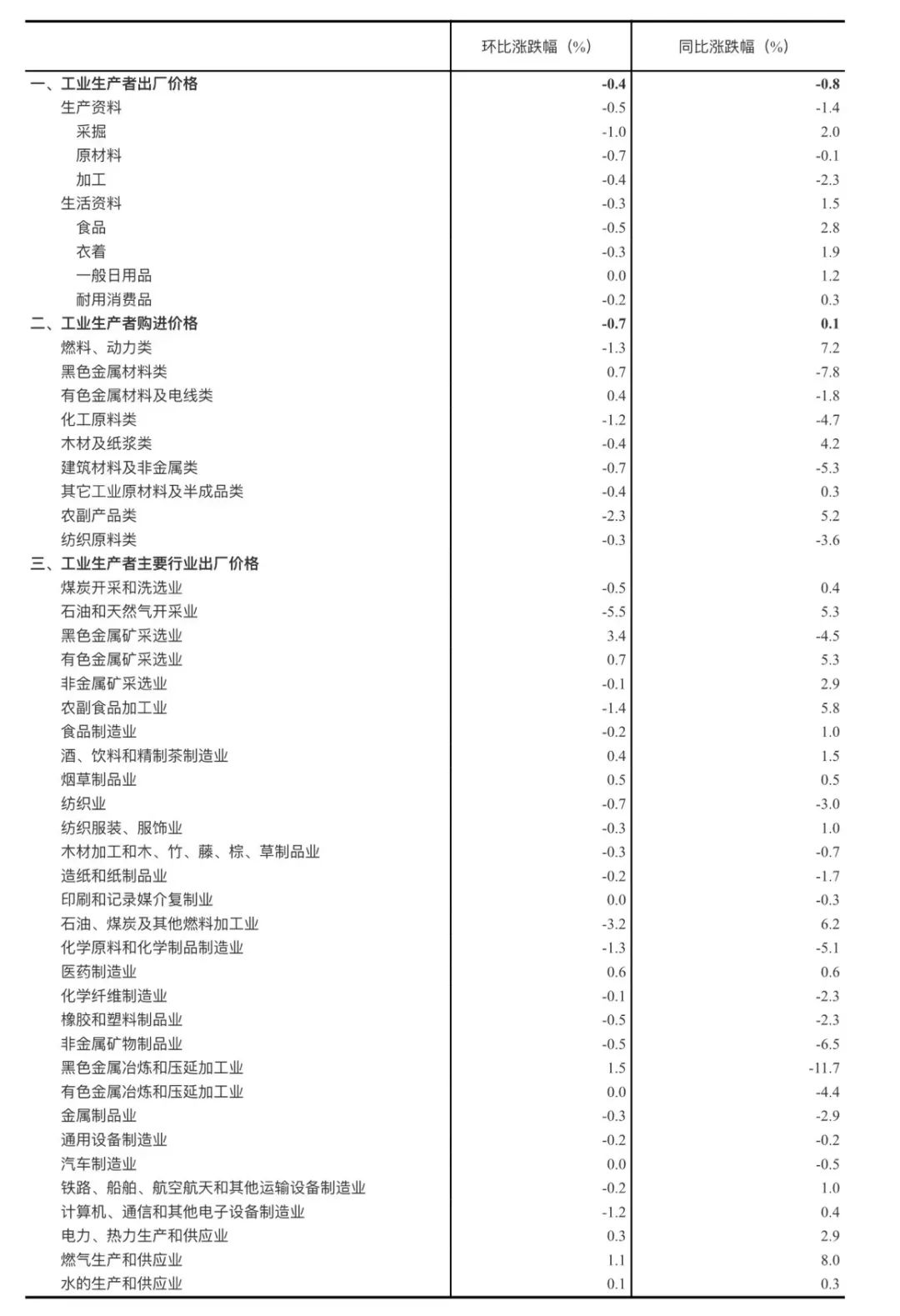 工業(yè)生產(chǎn)者出廠價格中,生產(chǎn)資料價格下降0.5%,影響工業(yè)生產(chǎn)者出廠價格總水平下降約0.38個百分點(diǎn)。其中,采掘工業(yè)價格下降1.0%,原材料工業(yè)價格下降0.7%,加工工業(yè)價格下降0.4%。生活資料價格下降0.3%,影響工業(yè)生產(chǎn)者出廠價格總水平下降約0.06個百分點(diǎn)。其中,食品價格下降0.5%,衣著價格下降0.3%,一般日用品價格持平,耐用消費(fèi)品價格下降0.2%。